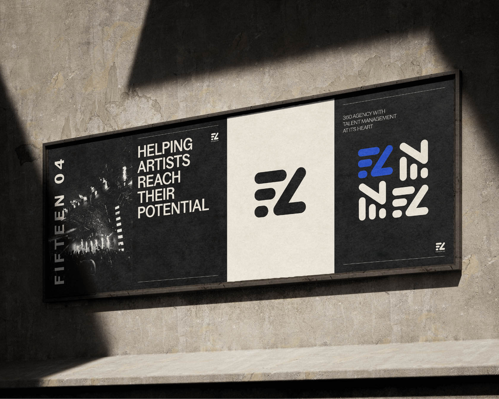 Global talent management agency, Fifteen04, came to us with a clear vision and need for a bold brand that could keep pace with the fast moving world of entertainment. With years of industry experience behind them, they needed an identity that felt digital, modern and built for growth. We developed a clean and versatile logo mark from an abstract F and 4, creating a recognisable symbol that worked across all areas of the business. This was brought to life through a striking visual style using monotone photography, layered textures and subtle motion inspired patterns.